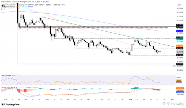 دوغ كوين مرتفعة بنسبة تقارب 1% في وقت كتابة التقرير يوم الجمعة، تتماسك فوق 0.1200 دولار بعد انخفاض بأكثر من 4% حتى الآن هذا الأسبوع. تتداول عملة الميم تحت المتوسطات المتحركة الأسية (EMAs) لمدة 50 يومًا و200 يوم، مما يعزز التحيز الهبوطي.