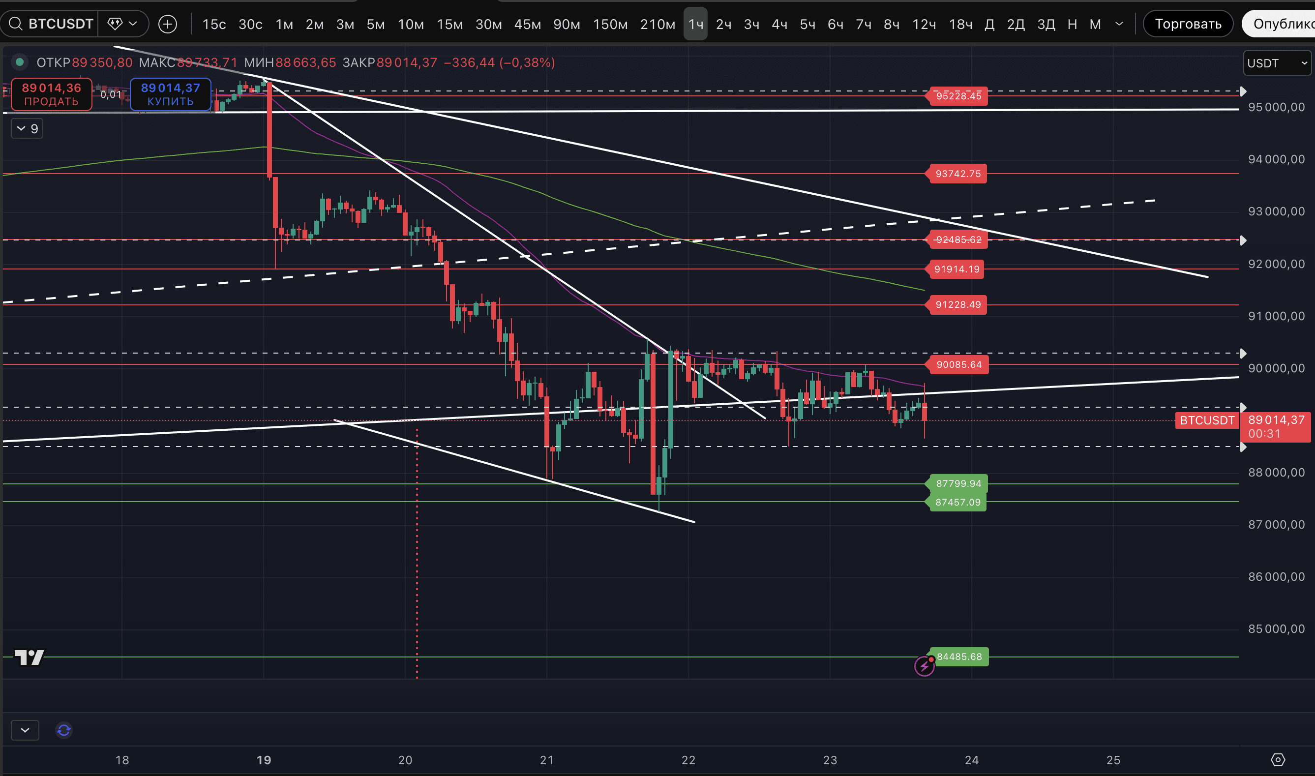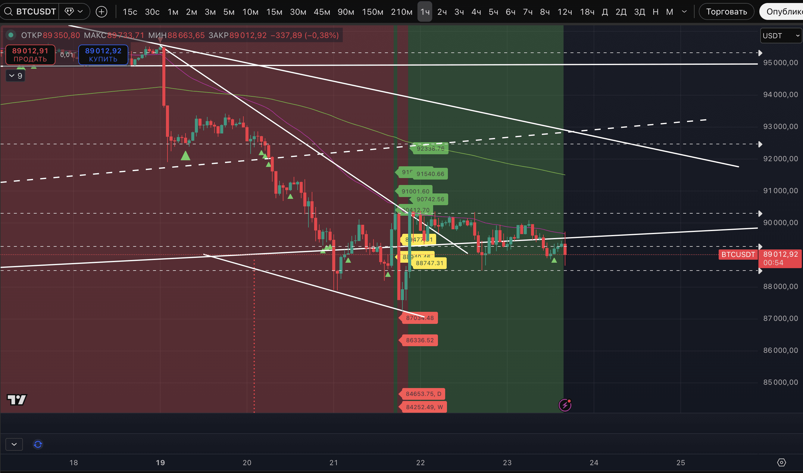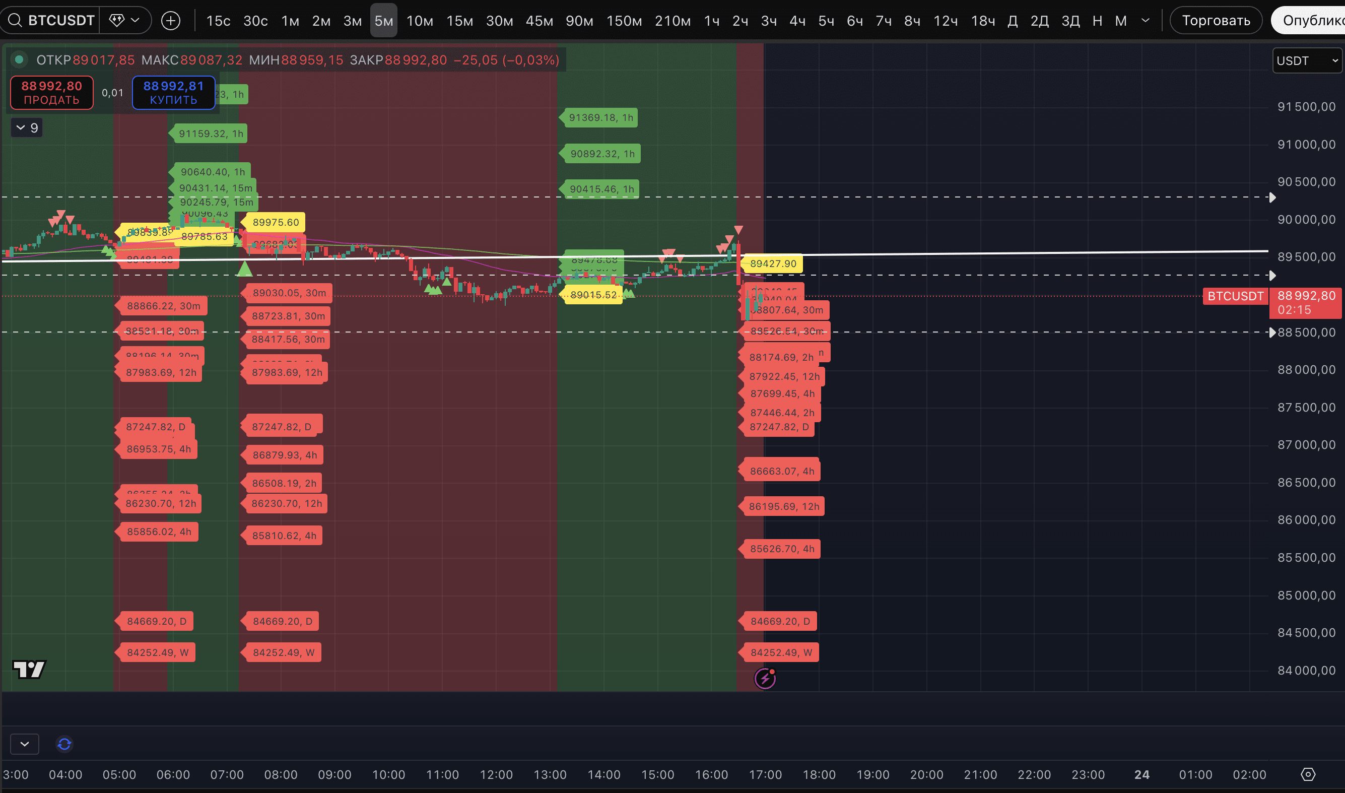 Ryzyko pozostaje takie samo - dopóki cena jest poniżej dwóch wskazanych oporów - patrzy na zakres najbliższych wsparć 87 457-87 779$. Lokalny 5-minutowy TF pokazuje znaczną gęstość głównych i dodatkowych celów trwałego trendu spadkowego aż do 87 247$.