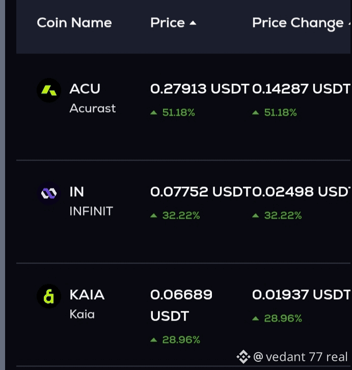 At 1:34 AM, these three coins — ACU (Acurast), IN (Infinit), and KAIA (Kaia) — were clearly highlighted based on momentum, volume strength, and trend behavior. As of now, all three have successfully turned into top gainers and are trading near the top of the market 🚀.