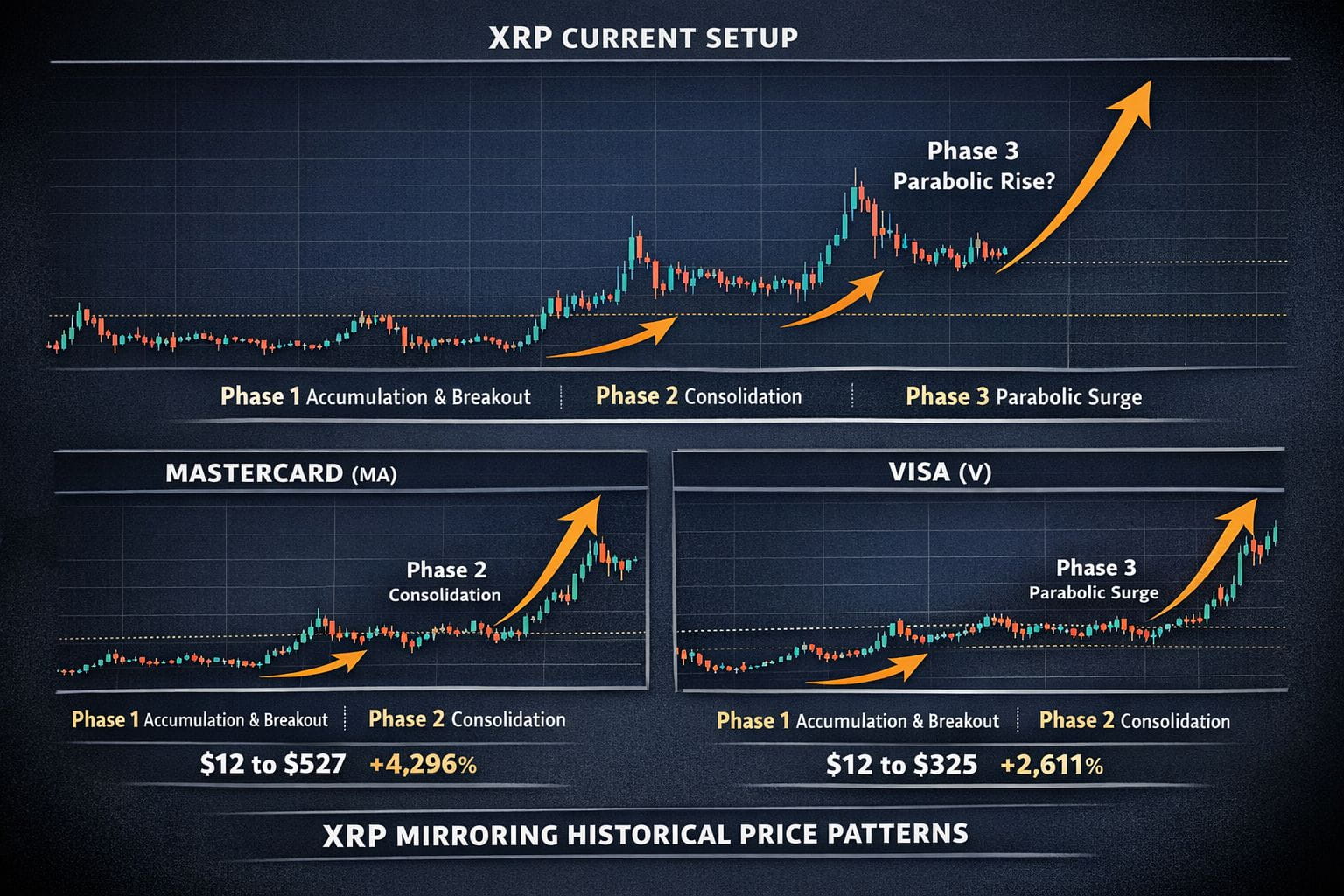 According to the analysis, XRP appears to be transitioning from Phase 1 into Phase 2, aligning closely with where Mastercard and Visa were positioned before their strongest growth periods.