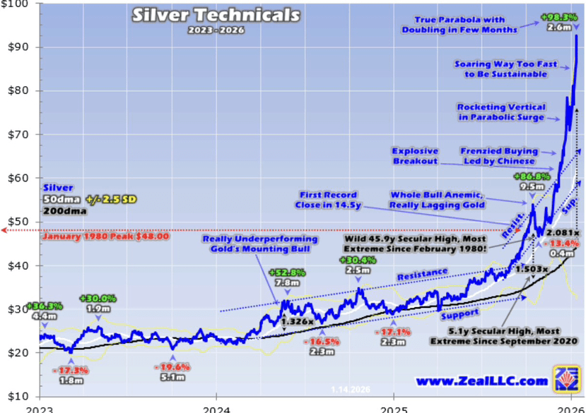 Cena srebra: istotne przełomy + wyraźna akceleracja → struktura paraboliczna, typowa dla aktywa monetarnego reagującego na: