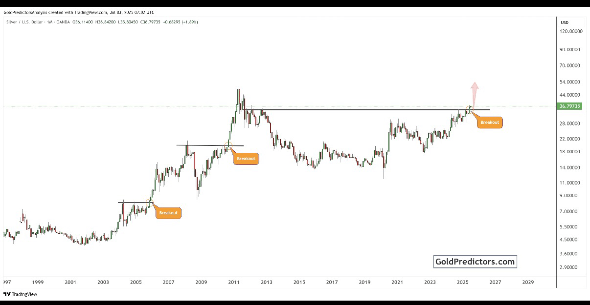 Srebro zwykle porusza się mocno przed migracją kapitału do bardziej “zmiennych aktywów monetarnych”.