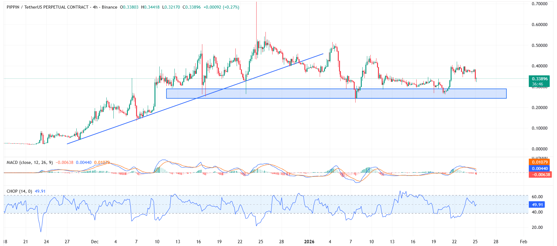 PIPPIN porusza się niezwykle nieprzyjemnie po utracie szczytu $0.70 i złamaniu trendu wzrostowego. Wskaźnik Choppiness osiągnął 49, co pokazuje, że cena nie ma wyraźnego kierunku, wciąż waha się w wąskim zakresie.