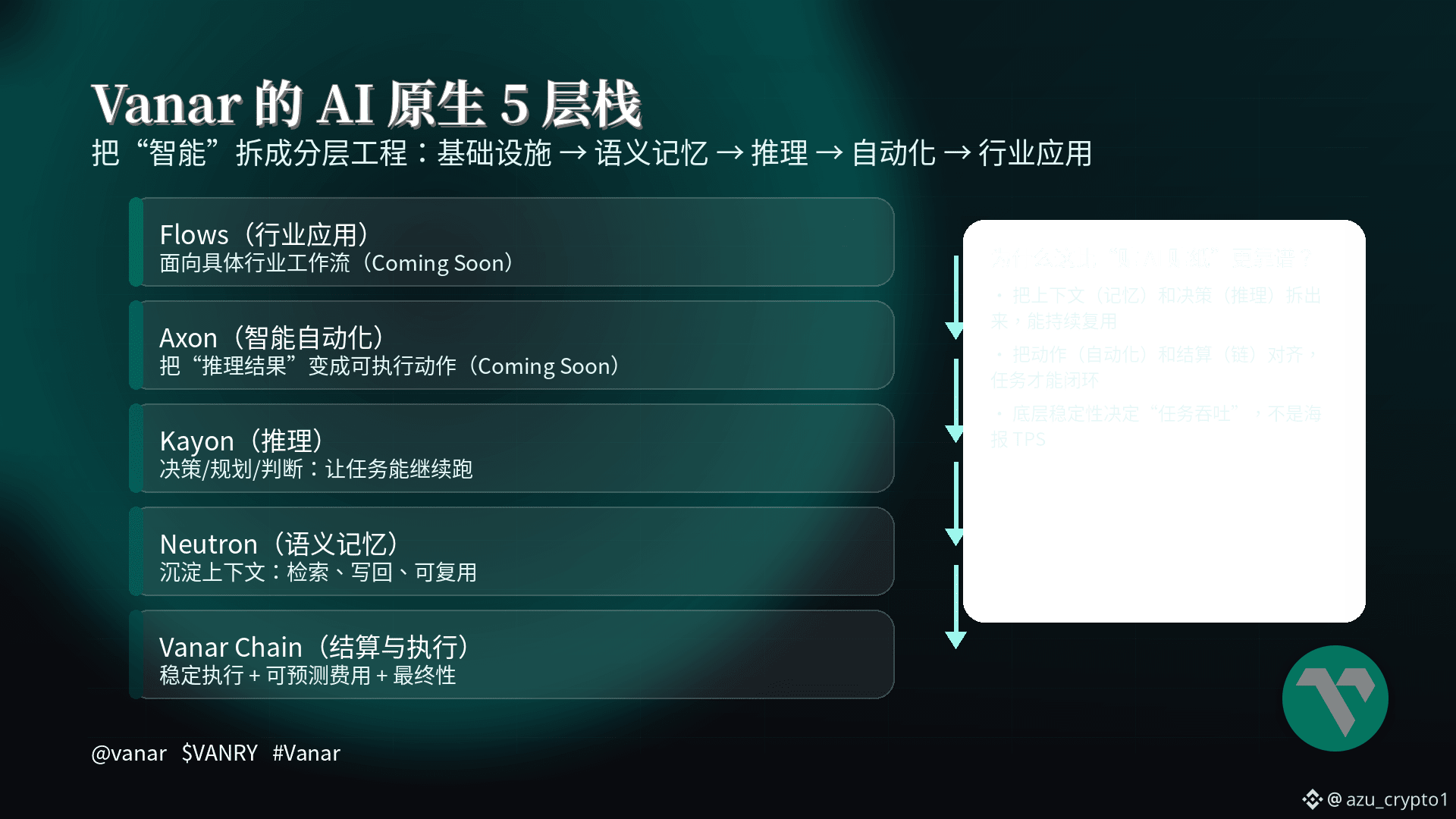 如果你去看 Vanar 的官网页面,它把所谓“AI 原生栈”拆成 5 层:最底层是 Vanar Chain(区块链基础设施),往上是 Neutron(语义记忆)、Kayon(推理)、Axon(智能自动化,标注 coming soon)、Flows(行业应用,标注 coming soon)。 这套分层有个很关键的价值:它把“AI 该在链上做什么”说得很清楚——底层负责稳定执行与结算,中间层负责让上下文能沉淀、能检索、能被推理层消费,最上层才是把推理结果变成可执行动作与行业应用。你可以不同意它的实现路径,但你很难否认:这比“给 dApp 加个机器人”更接近智能体真实需要的系统形态。
