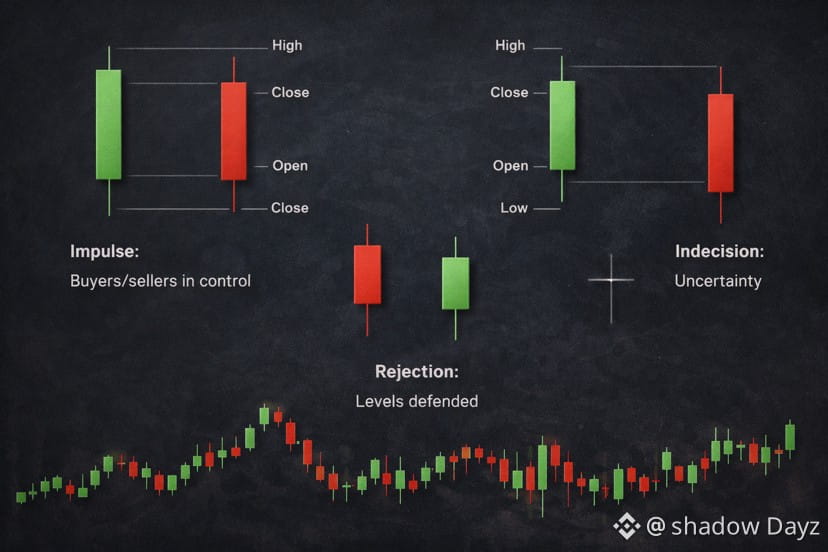 El cuerpo representa la distancia entre apertura y cierre, las mechas muestran hasta dónde el precio fue rechazado.