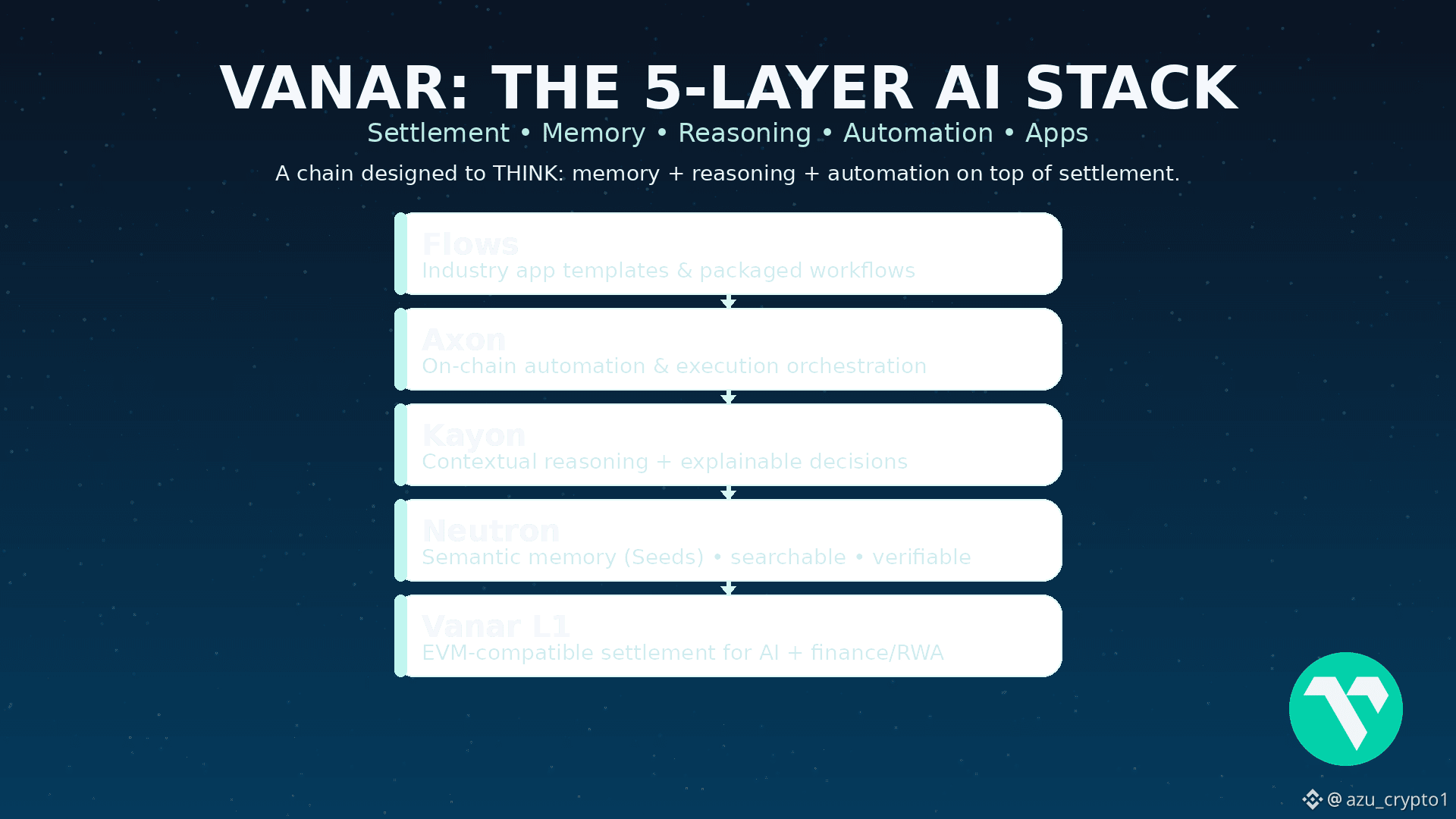 Vanar 给我的第一印象完全不一样。你打开官网,首页不是堆 TPS、不是堆 TVL,而是几行非常直接的话:“THE AI INFRASTRUCTURE FOR WEB3”“The Chain That Thinks”——AI 基础设施、会思考的链。更关键的是,它不是一句口号,而是拉了一整套 5 层架构 上来:最底下是 Vanar Chain 这条 L1,再往上是 Neutron(语义记忆)、Kayon(推理引擎)、Axon(自动化)、Flows(行业应用),官方直接说这是为 AI 工作负载和真实世界金融场景生的整套栈。