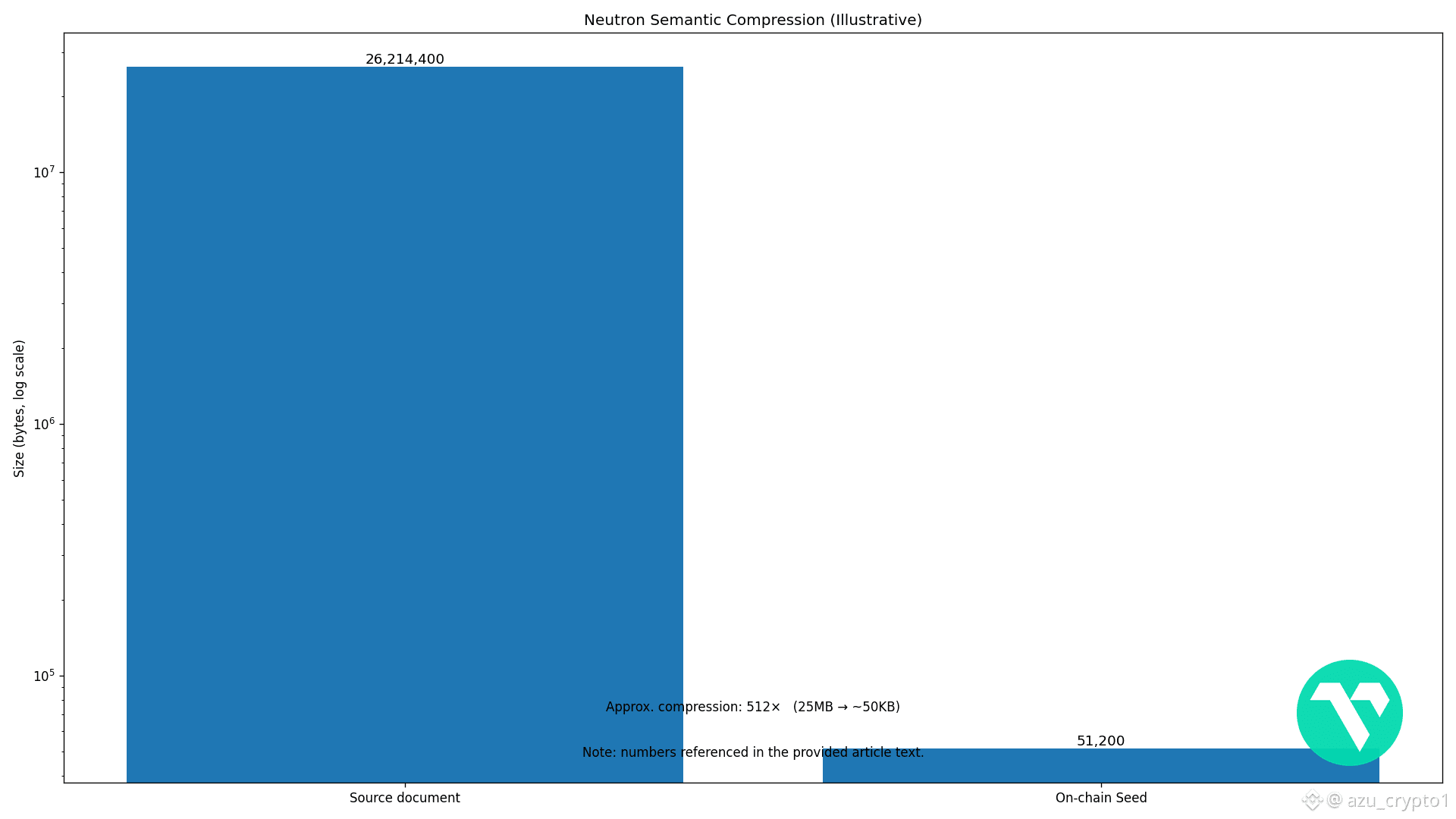 但真正把 Vanar 拉开差距的,是 第二层 Neutron。这里我必须多花几句——因为它直接决定了你信不信这条链真是 AI-native。官方对 Neutron 的定位是 “语义记忆层(semantic memory)”,一句话概括就是:它不是帮你存文件,而是把文件变成可编程记忆。Neutron 会把一个 25MB 的文档,通过语义、启发式和算法多层压缩,收缩到大约 50KB 的 “Seed”,完全上链、可验证、可查询。