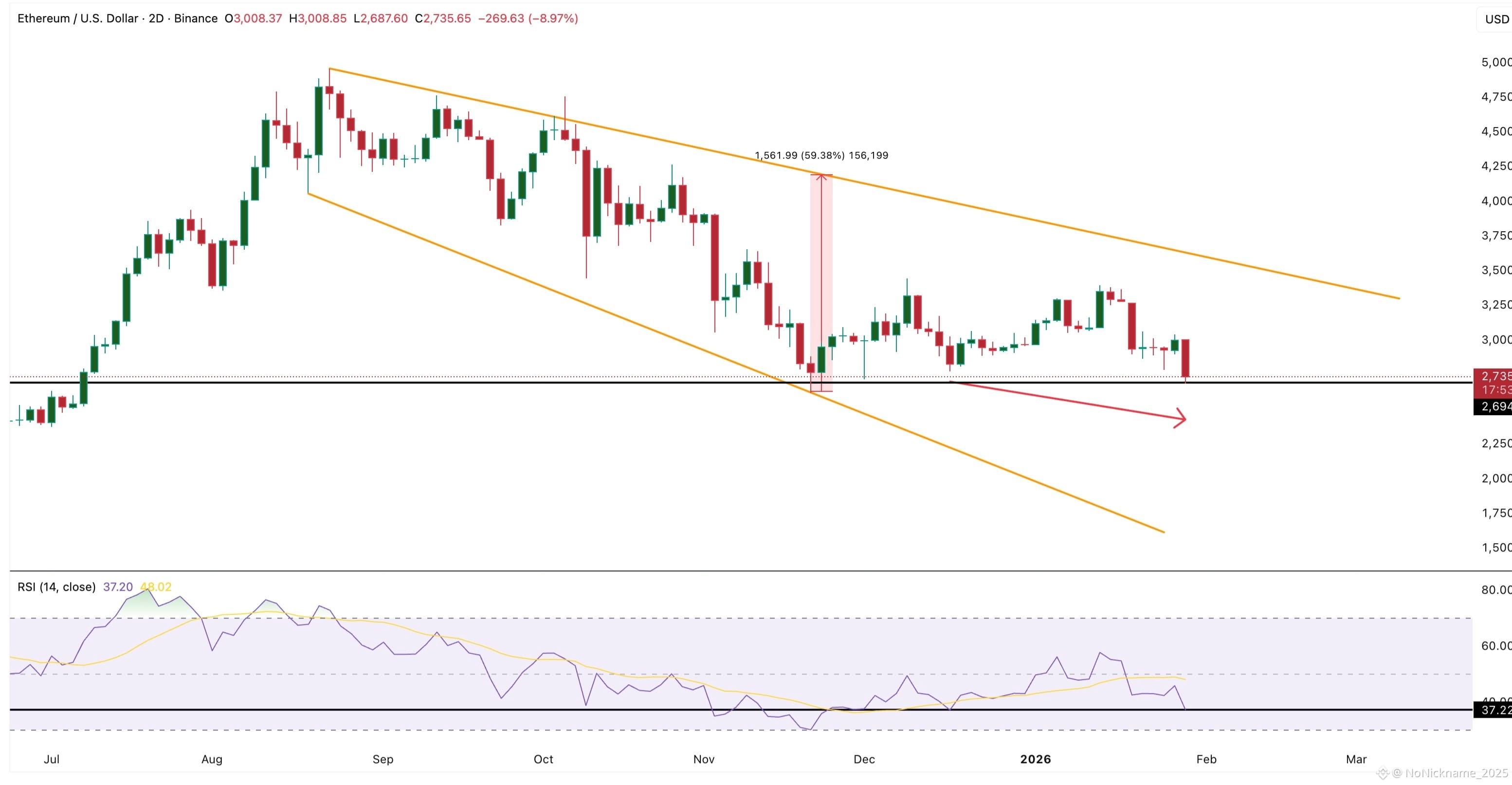 Индикатор относительной силы (RSI) указывает на формирование бычьей дивергенции. В период с середины декабря по конец января цена обновляла минимумы, тогда как значения RSI стабилизировались. Это классический признак истощения нисходящего тренда. Если курс удержится выше отметки $2690, вероятность разворота существенно возрастет.