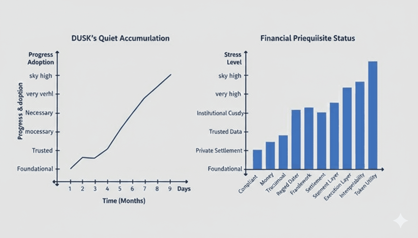O que mais se destaca é o quão pouco do progresso da Dusk se encaixa em uma narrativa típica de criptomoeda. Não há um único momento a apontar onde tudo se torna viral. Em vez disso, há uma lenta acumulação de pré-requisitos, dinheiro compatível, custódia institucional, dados confiáveis e um modelo de privacidade com o qual os reguladores podem conviver. Essas são as coisas que ninguém celebra até que estejam faltando.