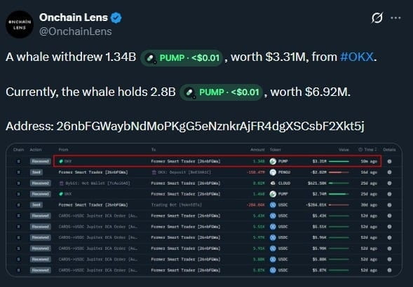 Theo Onchain Lens, một cá voi vừa rút 1.34 Tỷ PUMP (trị giá 3.31 triệu USD) từ sàn O.K.X.