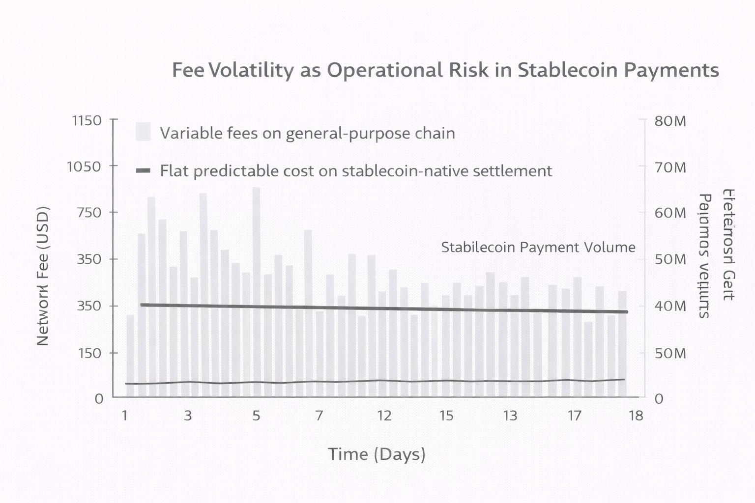 O uso de stablecoin expõe essa quebra de forma muito clara. A folha de pagamento opera em horários programados. O movimento do tesouro depende da certeza contábil. A liquidação do comerciante requer previsibilidade de custos. Nesse contexto, a volatilidade das taxas não é um incômodo. É uma fonte de fricção operacional que se acumula ao longo do tempo.