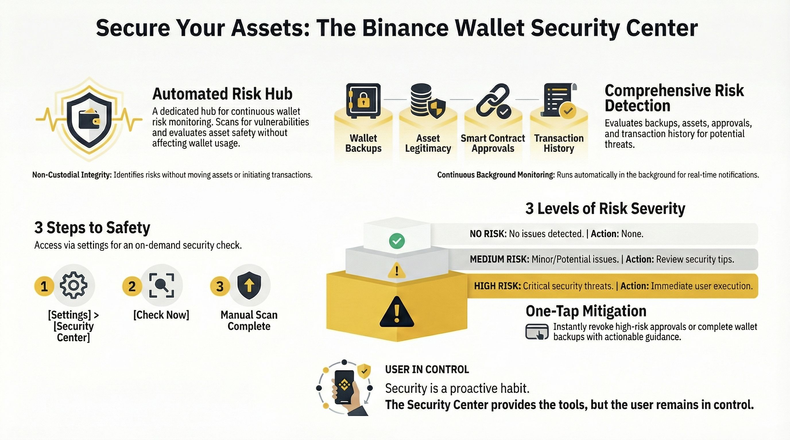 Preservação da Integridade Não-Custodial: Essas análises são puramente informativas. O Centro de Segurança atua como uma camada informativa que não possui permissões de "gasto", garantindo que a natureza não-custodial da carteira seja estritamente mantida.