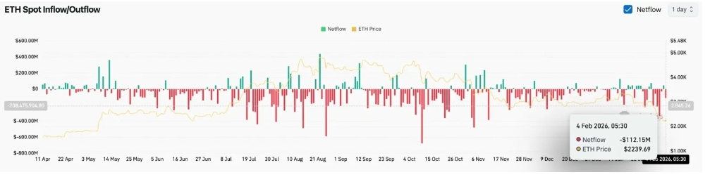 Apesar do fluxo positivo de ETFs, os mercados spot dizem algo completamente diferente. Os dados da Coinglass mostram saídas líquidas de 💲112,15 milhões de dólares em 4 de fevereiro - um dos maiores dias de distribuição no último mês.