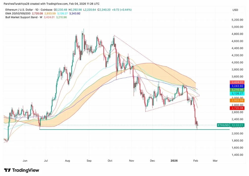 No gráfico diário👆$ETH está sendo negociado significativamente abaixo da zona de suporte do mercado em alta, que varia de 3 210💲 a 3 424💲. Esta faixa historicamente separou os mercados em alta dos mercados em baixa, e uma ruptura decisiva abaixo dela confirma a macroestrutura em baixa.
