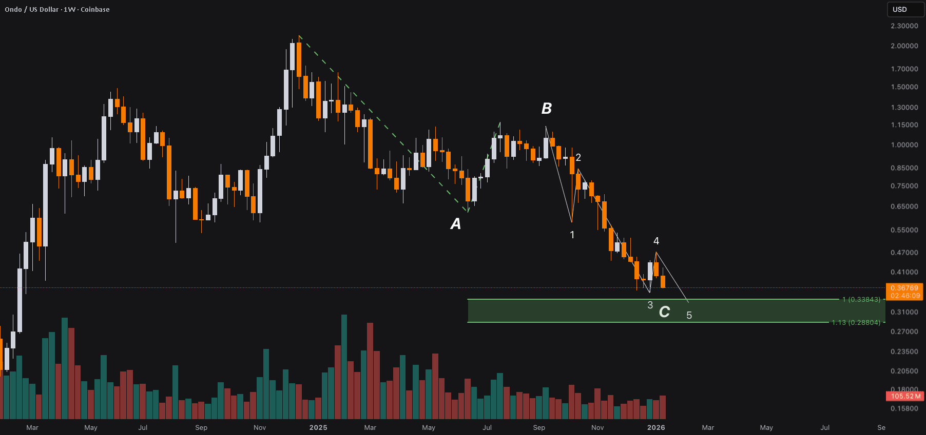 O volume de vendas tem diminuído, mas não há evidências de divergência bullish do RSI na semanal até agora ou quaisquer outras pistas bullish dos meus principais indicadores. Mas esta TA sugere um retrocesso adicional da Onda-C para ONDO. Níveis chave de suporte a serem observados estão entre $0.28 e $0.33.