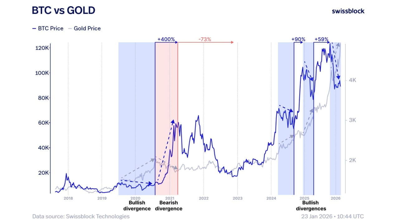 Sobre o positivo - agora a situação está mais próxima do cenário de alta. O ouro alcança máximas, enquanto o BTC se consolida. Segundo a lógica da Swissblock, essa é a divergência positiva que no passado muitas vezes terminava com um impulso de acompanhamento do BTC.