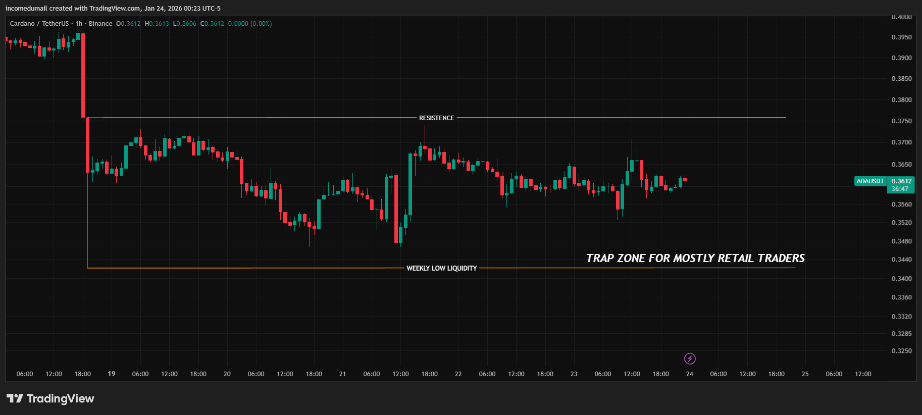 O preço atual (~0.361) está no centro exato da faixa, que é a pior localização possível para fazer negociações direcionais.