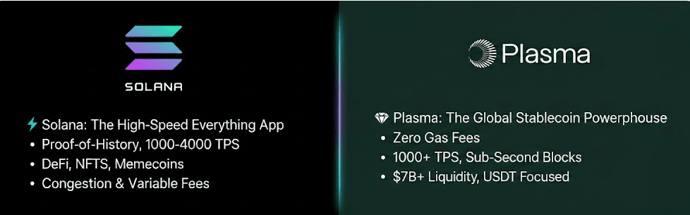 A escolha é clara. Solana é Times Square—vibrante, caótico, às vezes congestionado. Plasma é uma autoestrada de pagamentos dedicada. Sem tráfego de lançamentos de NFT ou frenesis de memecoins atrasando sua remessa.