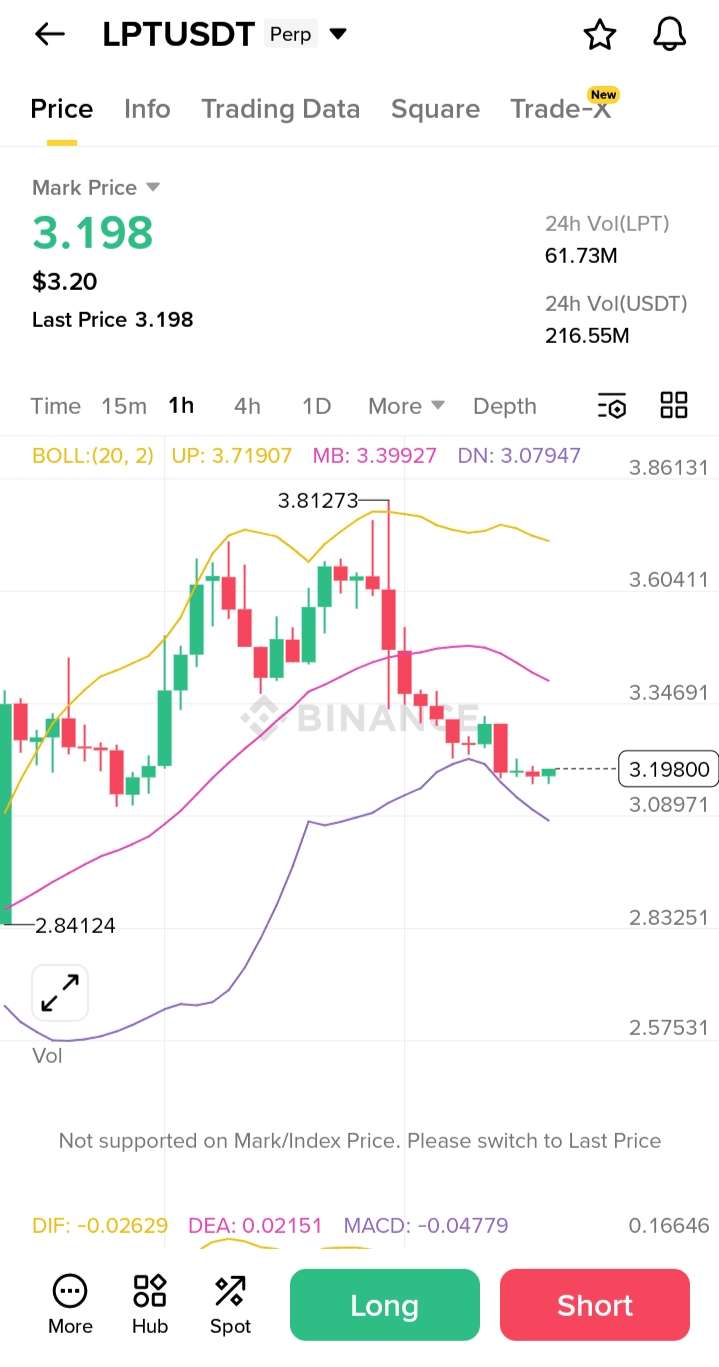 $LPT está atualmente sob pressão no gráfico de 1H, negociando a $3.198 com uma queda de -7,00% hoje. Após uma rejeição do nível de $3,81, o preço agora está testando a Banda de Bollinger inferior.