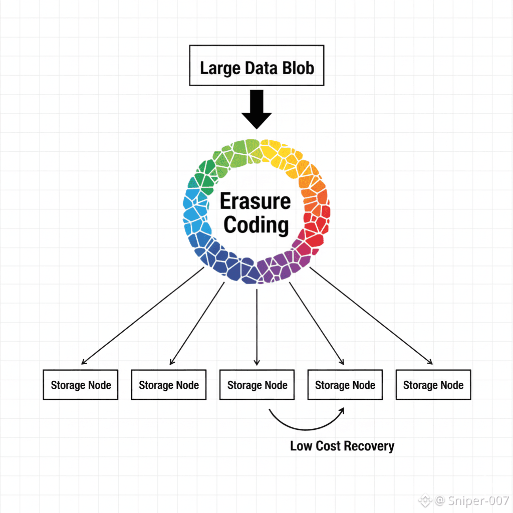 Instead of full replication, Walrus uses advanced erasure coding — think efficient spreading of data slices called slivers — so the cost stays low (~5× the blob size) and recovery is robust even if nodes go offline.
