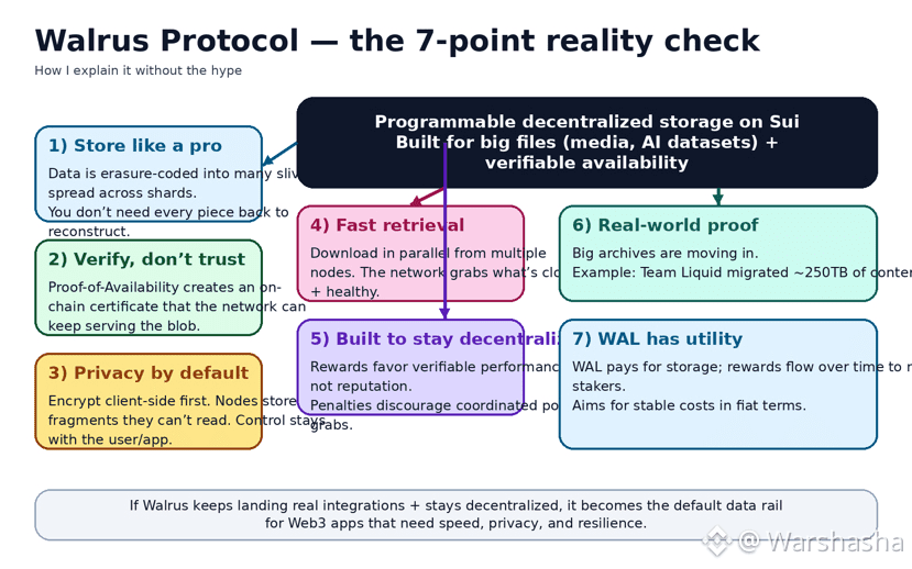 Here’s the part that matters in practice: Walrus erasure-encodes blobs into many slivers and distributes them across shards during a storage epoch. That means the network can lose chunks of participants and still reconstruct data — you’re not betting everything on a few servers staying online. It’s a storage system built around failure as a normal condition, not a rare event.
