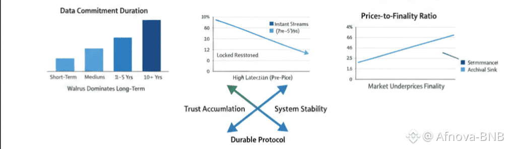 The audit trail reinforces this view. Immutability is often sold as a selling point. Here, it functions more like a gate. You don’t park compliance records or critical archives on an immutable layer unless you’ve stopped evaluating alternatives. That tells me Walrus isn’t competing for experimentation or trial usage it’s competing for finality. From a trading standpoint, finality is chronically underpriced because it doesn’t create churn, and most valuation frameworks quietly assume churn will always exist.