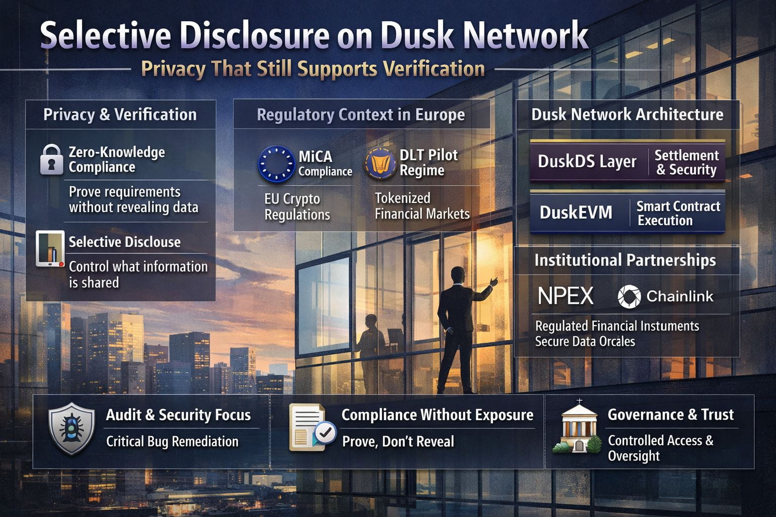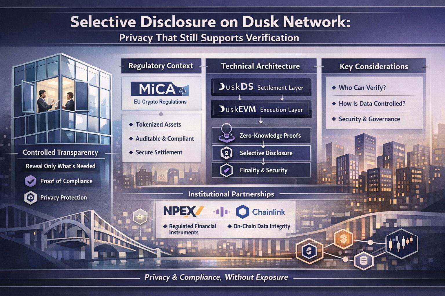@Dusk A divulgação seletiva é como ter uma conversa privada em um prédio de vidro. Você ainda está em um espaço compartilhado, mas controla qual janela se abre, quando se abre e quem pode olhar. Eu continuo voltando a essa imagem quando leio o material recente da Dusk Network, porque o projeto está explicitamente tentando reconciliar dois instintos que normalmente lutam entre si em blockchains: manter a atividade financeira confidencial, enquanto ainda a torna comprovável quando alguém tem um motivo legítimo para verificá-la. A própria Dusk enquadra a mudança como uma transição de transparência radical para divulgação seletiva, e essa é uma escolha de palavras reveladora - é menos sobre segredo por si só e mais sobre moldar o que é revelado e a quem.