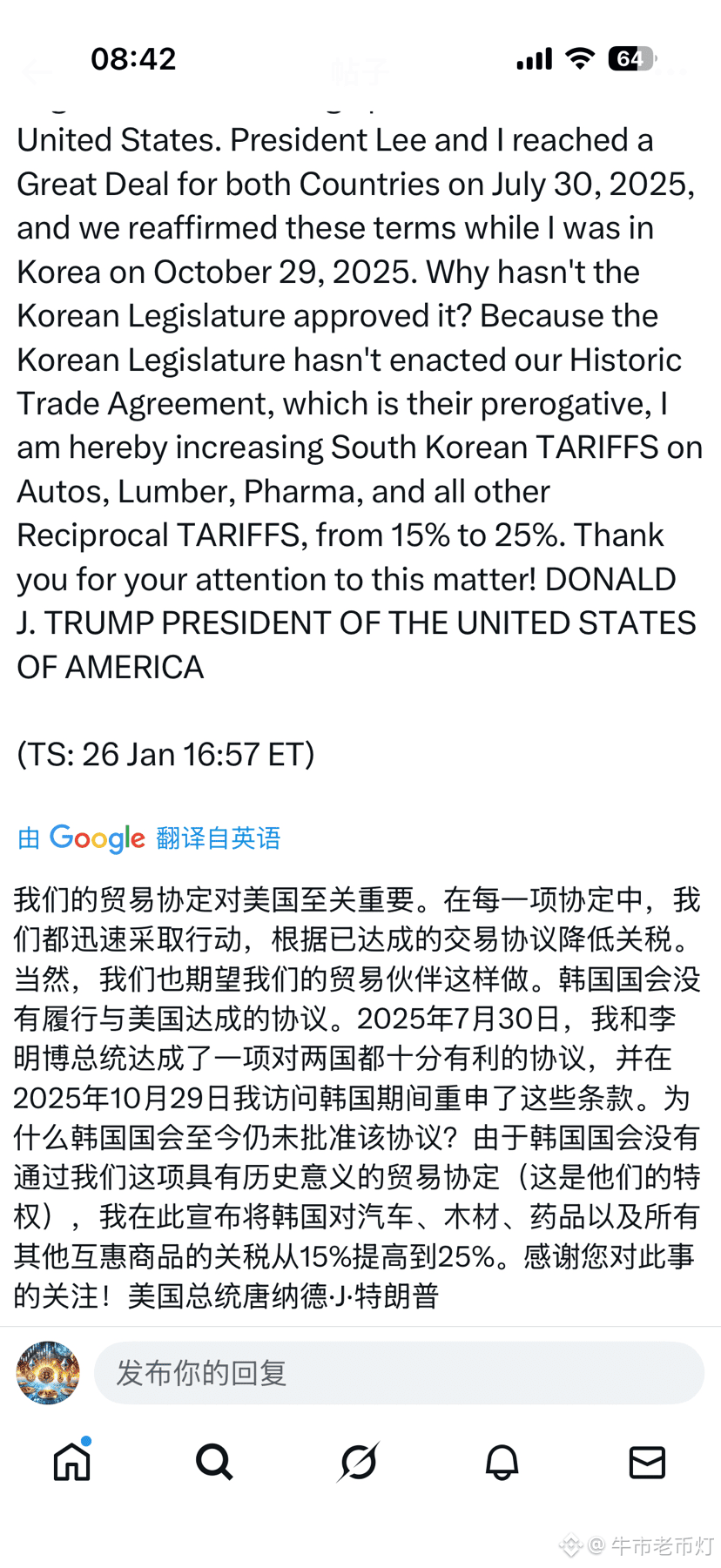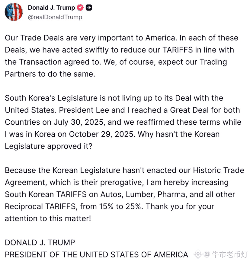 就在刚刚,特朗普突然在社交平台扔出重磅炸弹:因韩国国会未履行贸易协议,将对韩国汽车、木材、药品等商品的关税从15%直接飙到25%!