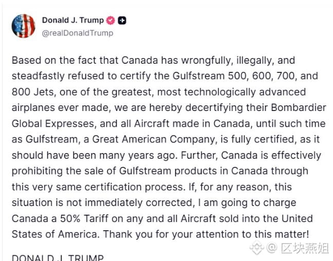 除此之外,特朗普当天还升级了与加拿大的贸易紧张关系,指责渥太华方面不公平地阻挠美国湾流(Gulfstream)公务机的适航认证,并威胁采取报复措施。此举可能严重扰乱北美飞机市场。