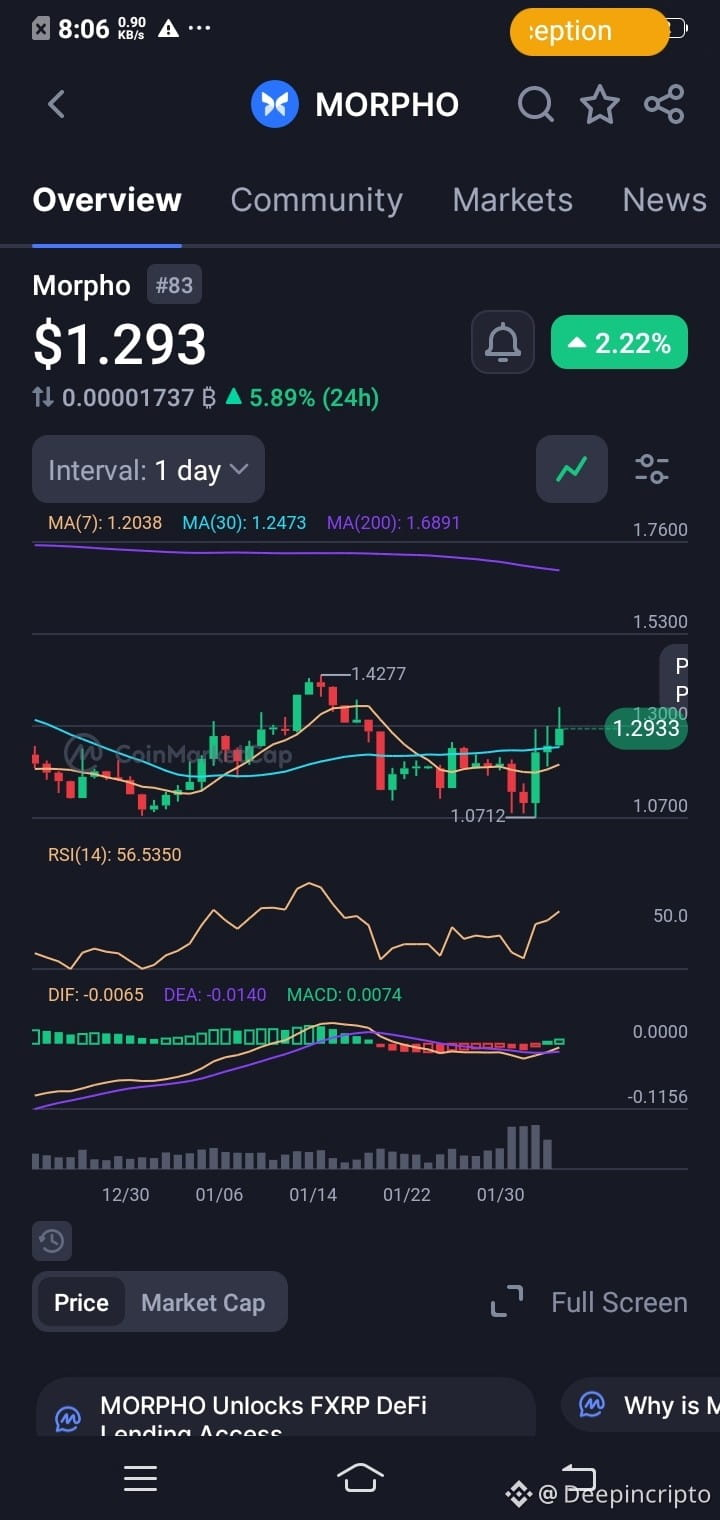 1$MORPHO Price Action & Trend: The price ($1.293) is trading above key short-term moving averages: MA(7) at 1.2038 and MA(30) at 1.2473. This indicates recent upward momentum and suggests buyers are in control in the near term.