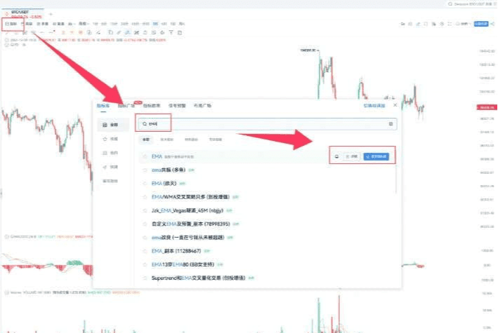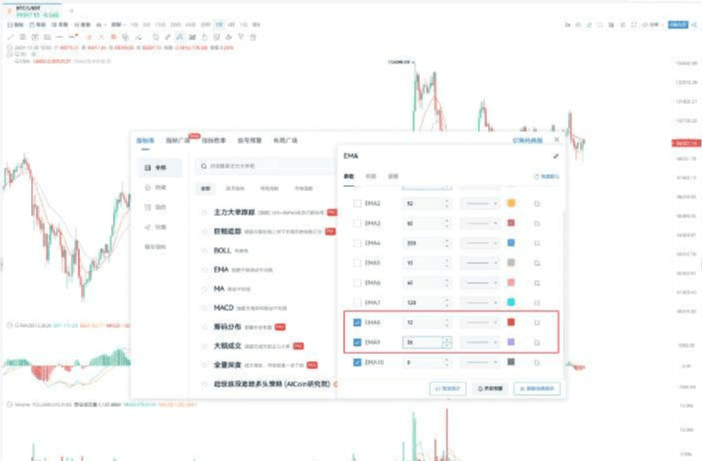Folosind Bitcoin (BTC/USDT) ca exemplu, setează combinația de parametri EMA(12,26) pentru analiza pe un interval de 1 oră.