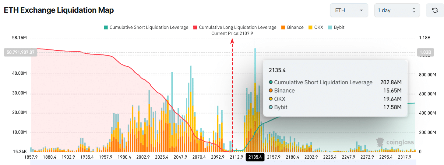 Phe Long đang chiếm ưu thế khi xây dựng các vị thế đòn bẩy trị giá gần $248 triệu đô tại vùng giá $2,060, trong khi phe Short chỉ có khoảng $190 triệu đô tại vùng $2,135.