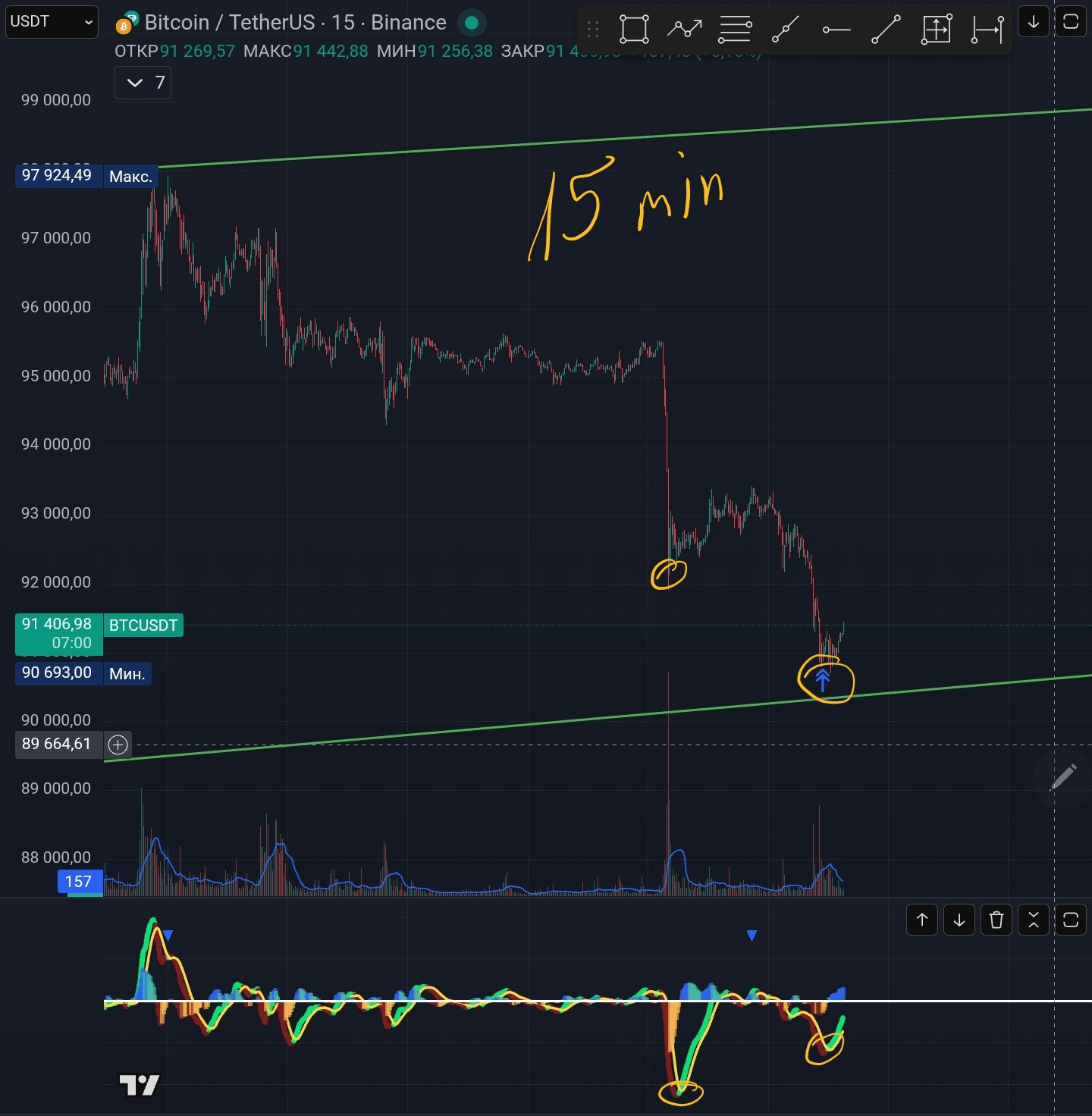 $BTC Pe graficele cu intervale de 1 oră și 15 minute se observă o divergență clară de tip bullish, este posibilă o creștere până la nivelul de 93-95 sau, în cel mai bun caz, până la aproximativ 98.