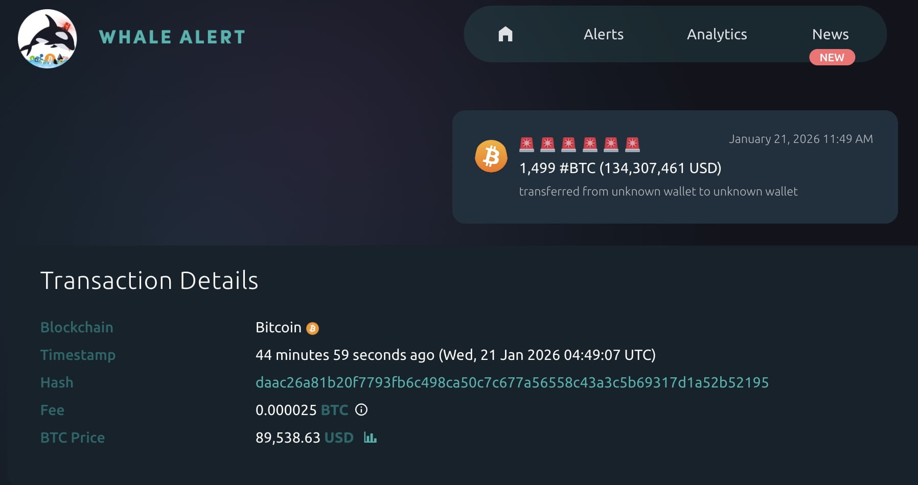 O tranzacție mare de Bitcoin a fost detectată pe blockchain ca 1,499 BTC, în valoare de aproximativ 134,3 milioane de dolari, fiind transferată de la un portofel necunoscut la alt portofel necunoscut, conform datelor de monitorizare a blockchain-ului.
