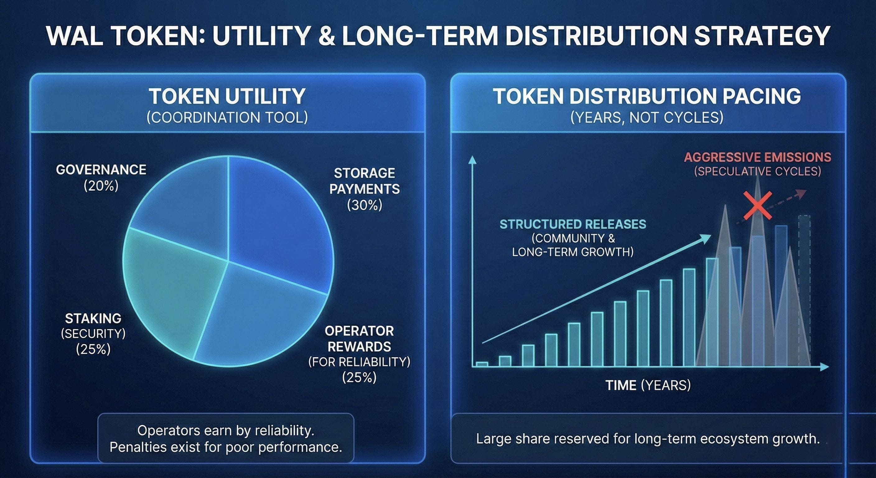 The WAL token also makes more sense the deeper you go. It’s not positioned as a speculative instrument first. It’s a coordination tool. WAL is used to pay for storage, reward operators, secure the network through staking, and participate in governance. Operators earn by being reliable, not by chasing short-term rewards, and penalties exist for poor performance. Everyone involved carries responsibility, not just upside.