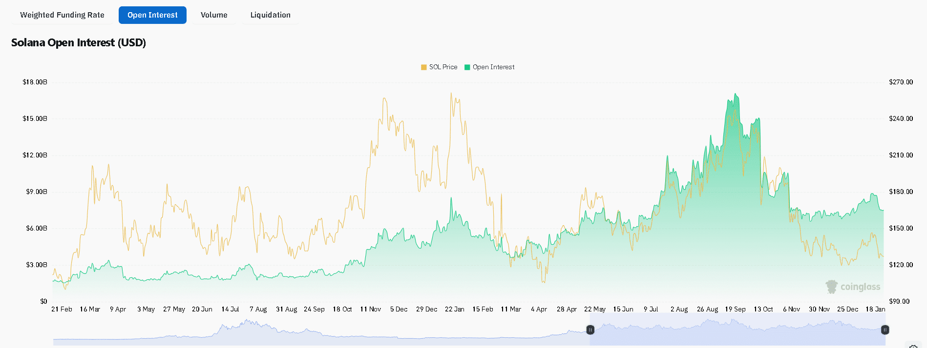 Conform datelor CoinGlass, din decembrie, contractele deschise (OI) ale Solana au crescut de la aproximativ 6,6 miliarde de dolari la peste 8,8 miliarde de dolari. Dar problema este că - prețul scade simultan.