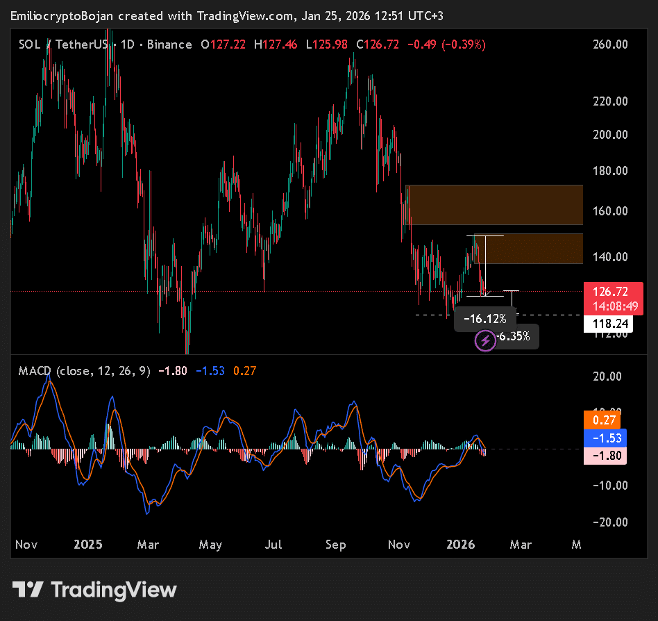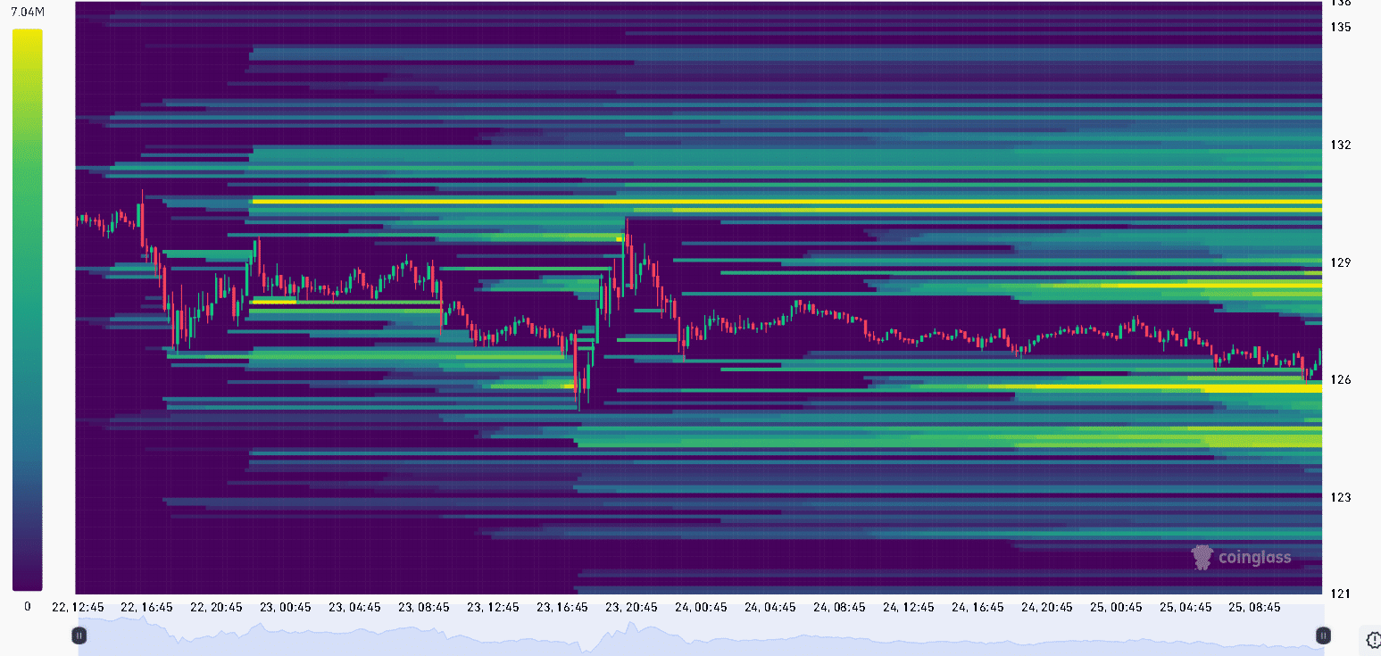 Datele arată că SOL are zone de lichidare semnificative între 123–126 de dolari și deasupra a 130 de dolari. Aceasta înseamnă că, înainte ca prețul să se apropie cu adevărat de 117–119 de dolari, o zonă de suport mai puternică, lichiditatea de jos rămâne destul de activă.