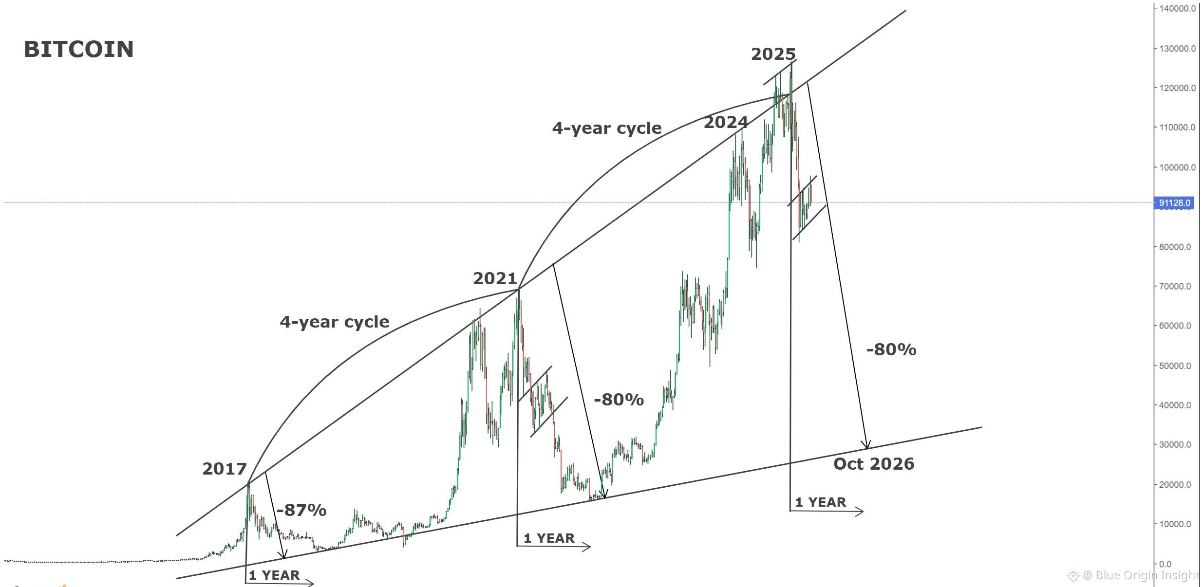 If $BTC continues to respect its historical cycle structure, the current data suggests a potential downside target around $29,000 by October 2026.