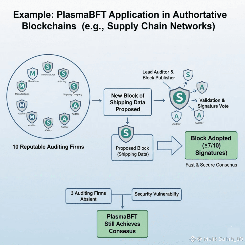 Imagine a supply chain blockchain where the network is managed by 10 reputable auditing firms (manufacturers, shipping companies, and auditors). When a new block of shipping data is proposed, one of the auditing firms acts as the lead auditor and publishes the block. The other auditing firms validate the block and submit a signature vote. If at least 7 auditing firms (≥2/3) agree, the block is immediately adopted. Even if 3 auditing firms are absent or there is a security vulnerability, PlasmaBFT still achieves fast and secure consensus.