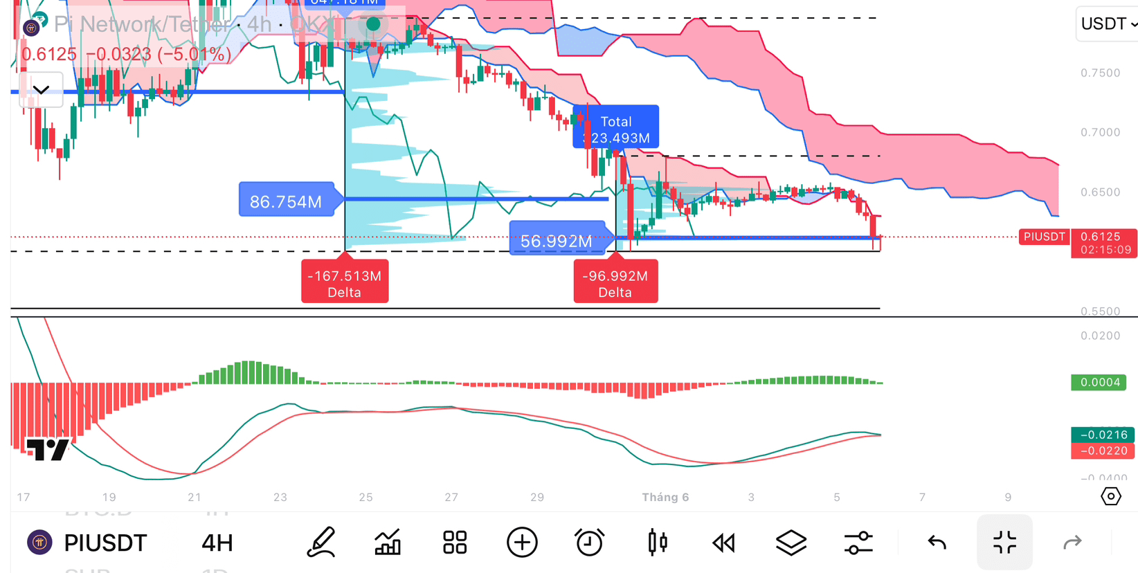 • Цена PIUSDT находится глубоко под облаком Kumo красного цвета – нисходящий тренд все еще очень сильный.