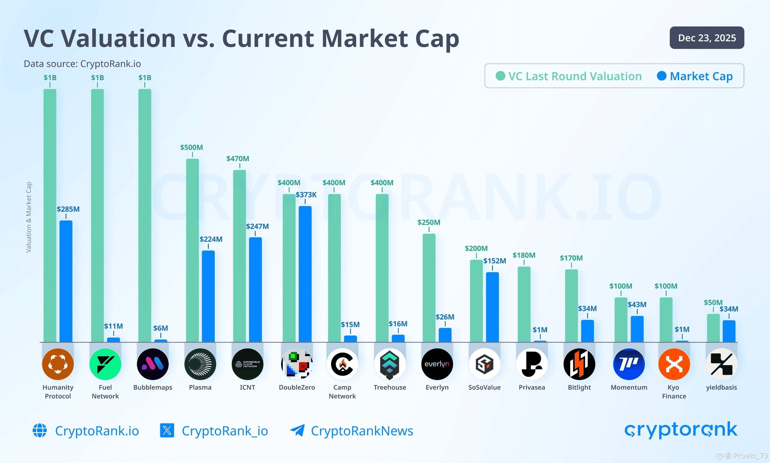 Инфографика от #CryptoRank наглядно показывает разрыв между тем, как проекты оценивались венчурными фондами на последних раундах, и тем, как их оценивает рынок сейчас.