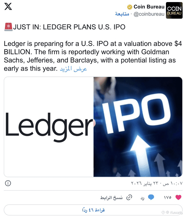 دخلت شركة ليدجر مرحلة حاسمة مع استعدادها للإدراج في الأسواق العامة الأميركية بتقييم يتجاوز 4 مليارات دولار. ويمثل الطرح العام الأولي المحتمل لليدجر إحدى أبرز المحطات لشركة متخصصة في أمن العملات الرقمية تدخل أسواق رأس المال التقليدية. ويرى متابعو القطاع في هذه الخطوة إشارة ثقة للنظام البيئي الأوسع للأصول الرقمية.