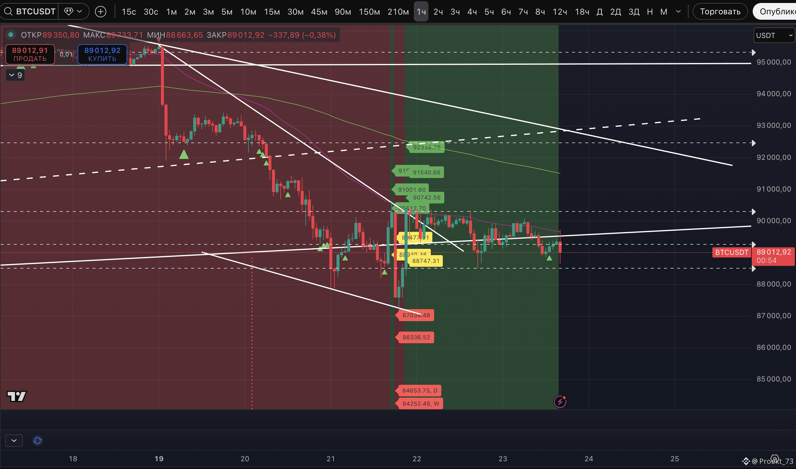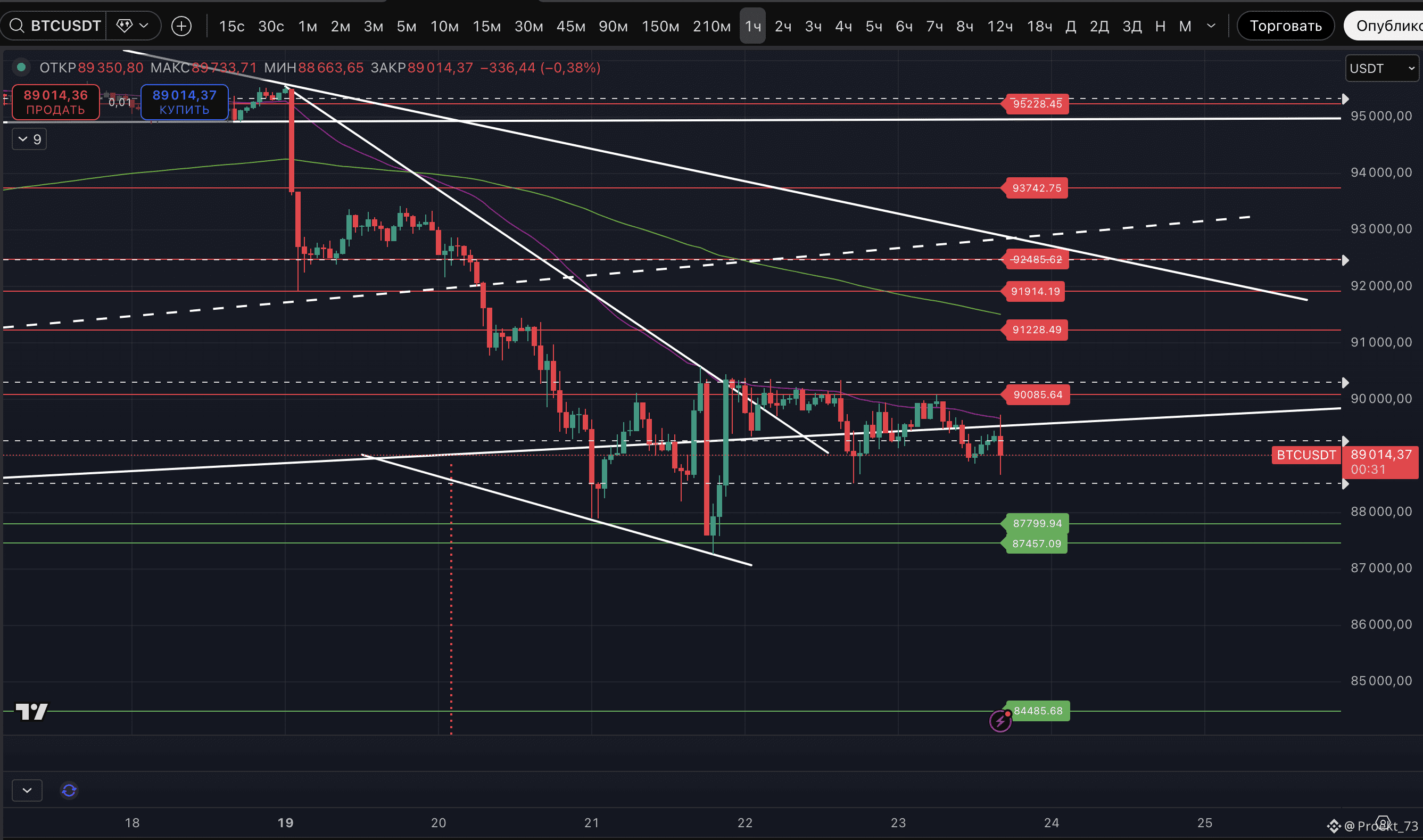 EMA 50 часового ТФ сейчас в районе 89 653$. А горизонтальное сопротивление опустилось с 90 314$ до 90 085$. Но понижение планки, как видите, ситуацию не исправило.