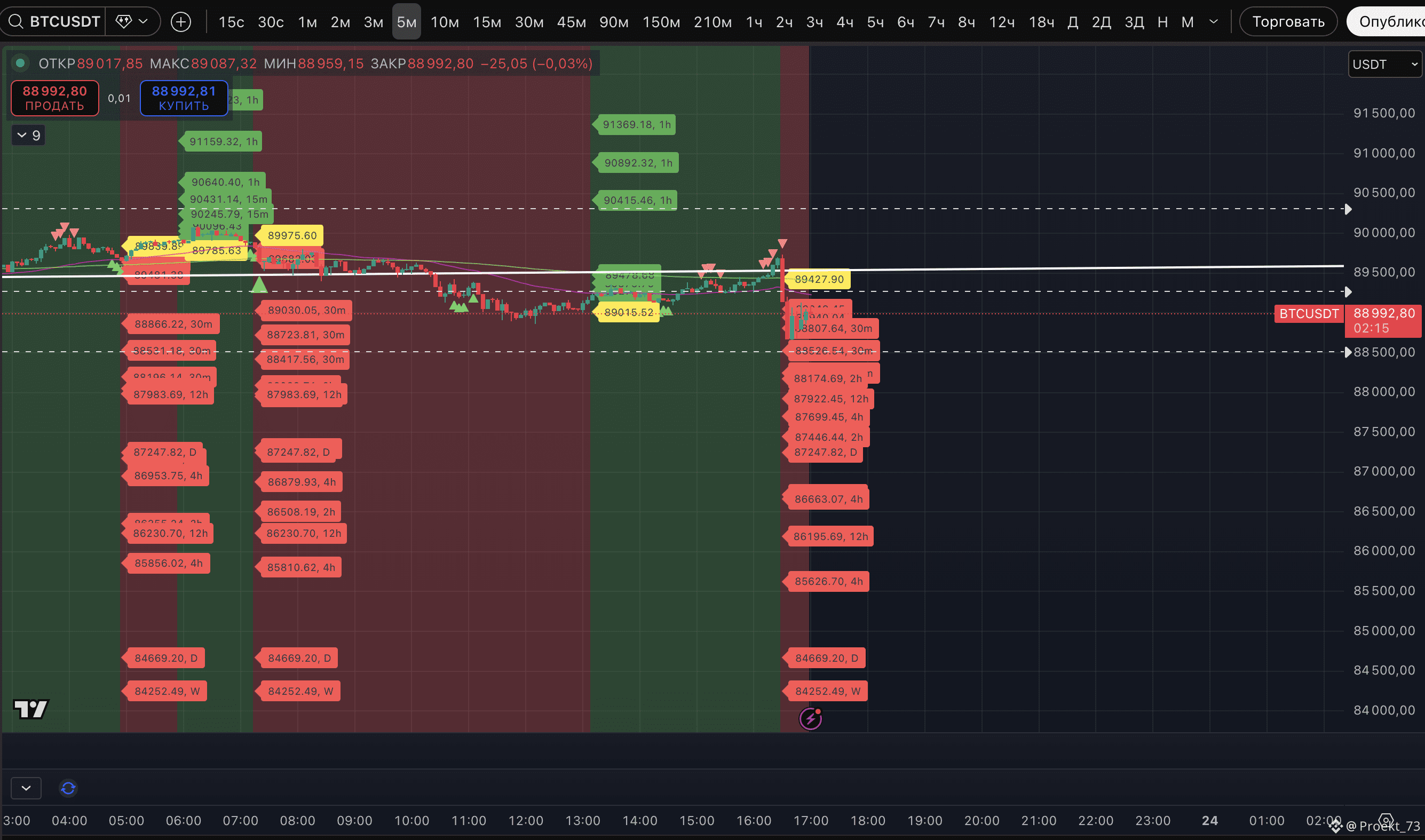 Риск прежний - пока цена ниже двух указанных сопротивлений - она смотрит на диапазон ближайших поддержек 87 457-87 779$. Локальный 5-минутный ТФ показывает существенную плотность основных и дополнительных целей устойчивого даунтренда как раз до 87 247$.