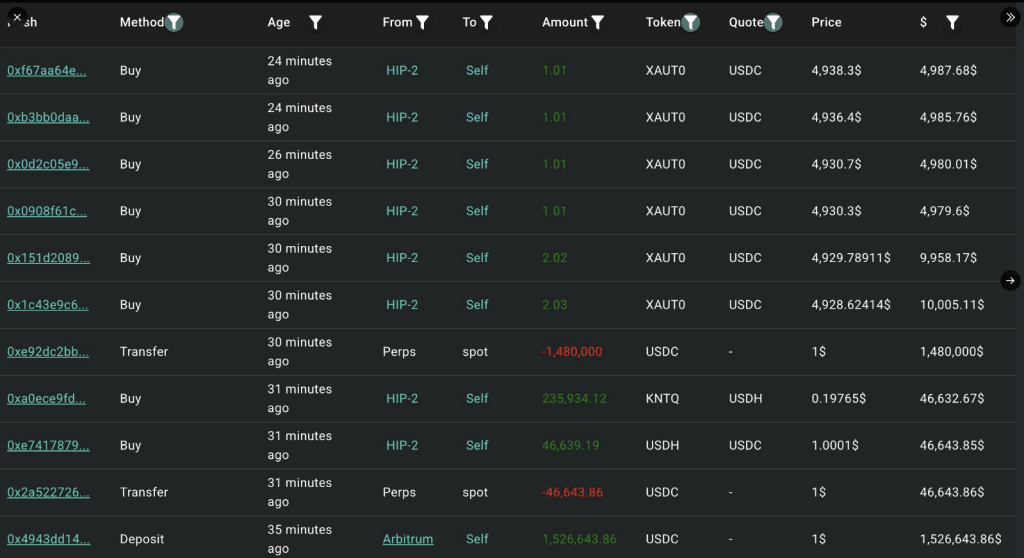 Согласно данным сетевых трекеров, один адрес перевел $1.53 миллиона в USDC в Hyperliquid для покупки XAUT. Отчеты отмечают, что тот же кошелек ранее купил около 481 XAUT, покупка стоимостью примерно $2.38 миллиона.