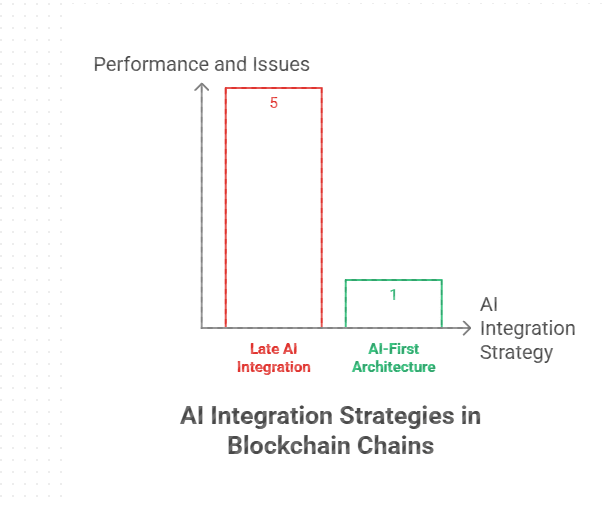К середине 2026 года разделение очевидно и, честно говоря, болезненно смотреть. Некоторые цепочки пытались добавить ИИ позже, как аксессуар. Другие на самом деле начали с учетом ИИ. Те, кто добавил его поздно, уже сталкиваются с проблемами. Высокая стоимость газа. Сломанный контекст. Агенты, которые забывают все. Решения, которые никто не может объяснить. Постоянный человеческий надзор.
