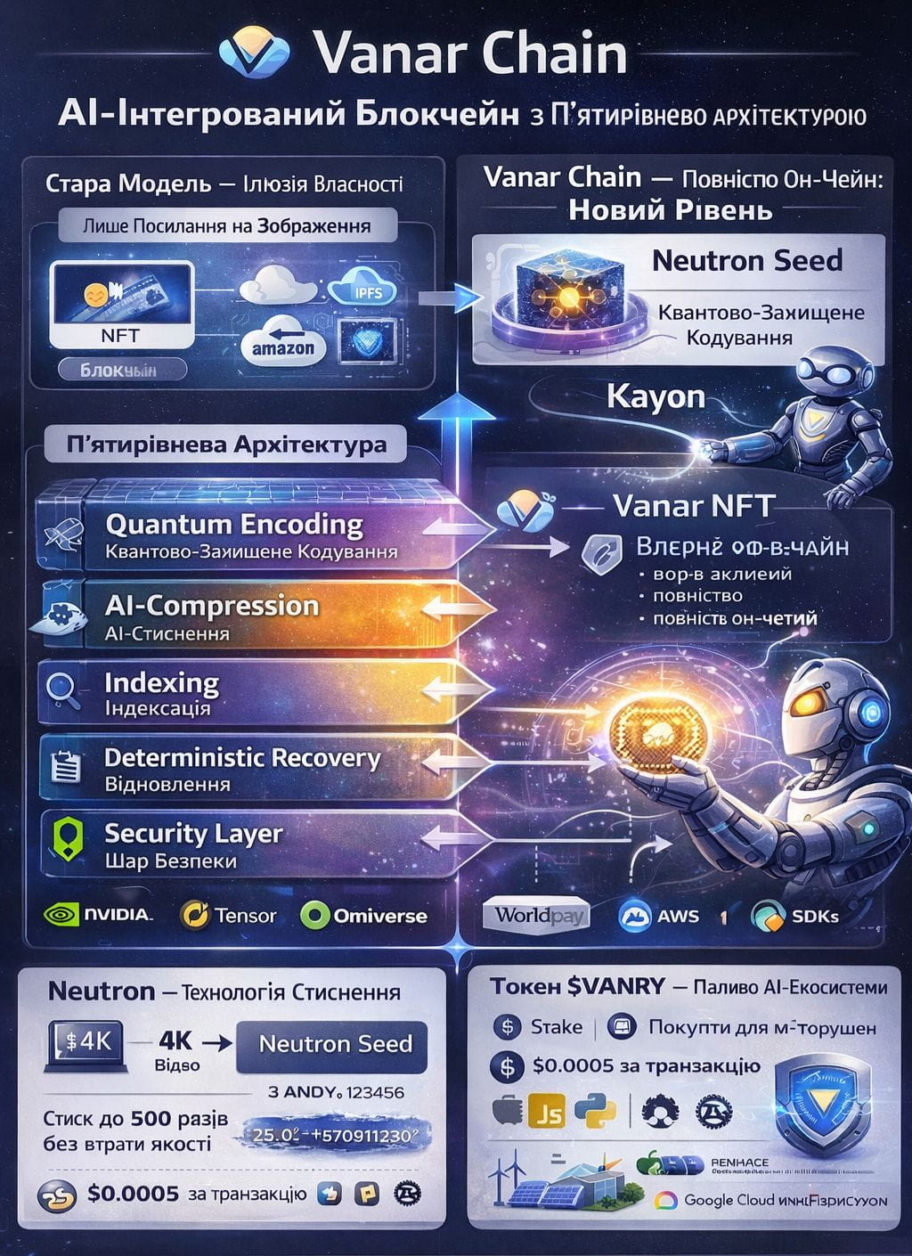 А тепер уявіть наступний рівень — Kayon, децентралізований движок штучного інтелекту, який читає ці Seeds, розуміє контекст, зв'язки між даними і може приймати рішення. Це не якийсь зовнішній API, який може впасти разом з AWS — це логіка, вбудована в сам ланцюг. Коли AWS впав у квітні 2025 року і великі біржі зависли, Vanar продовжував працювати, бо його дані живуть он-чейн. Технічна магія криється у чотириступеневому конвеєрі: AI-стиснення, квантово-захищене кодування (так, вони готуються до епохи квантових комп'ютерів), індексація для швидкого пошуку та детерміністичне відновлення. Для розробників це означає EVM-сумісність із повними SDK для JavaScript, Python та Rust, фіксовану комісію $0.0005 за транзакцію та інфраструктуру Google Cloud на відновлюваній енергії. Токен $VANRY тут не просто газ — він паливо для всієї AI-екосистеми, від стейкінгу до оплати за AI-інструменти, що робить його унікальним у своєму роді. Партнерства з NVIDIA дають доступ до CUDA, Tensor, Omniverse для розробників, а інтеграція з Worldpay та Mastercard відкриває двері до PayFi — токенізованих реальних активів із вбудованою комплаєнс-перевіркою через Kayon.