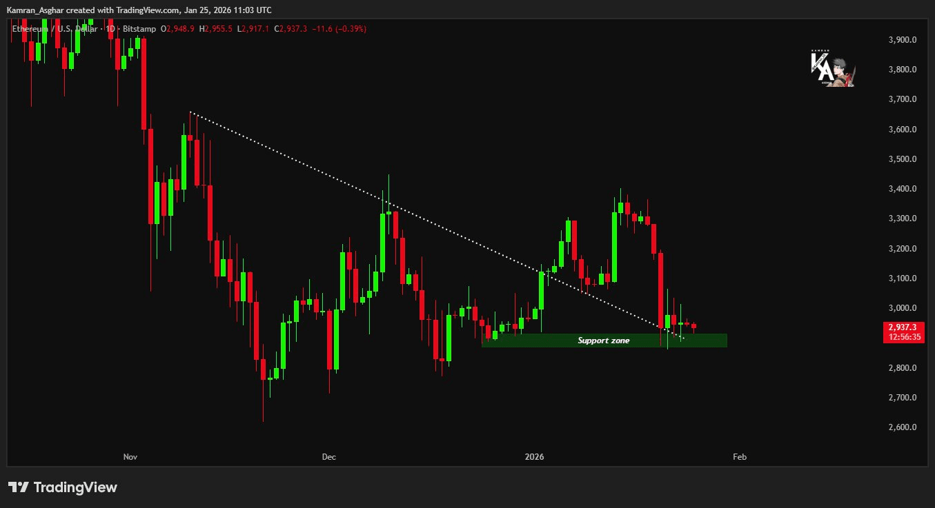 Если посмотреть на график, который у нас на столе, ситуация совершенно ясна: Ethereum борется за свою жизнь в этой "зеленой зоне поддержки", которую вы видите внизу, прямо между $2,850 и $2,900. 🕯️ Эта пунктирная линия нисходящего тренда была цементным потолком, который не дает нам вырваться, и каждый раз, когда мы пытаемся поднять голову, рынок дает нам удар. Пробить $3,000 вниз было не просто числом, это был психологический удар, который заставил многих продавать от страха.