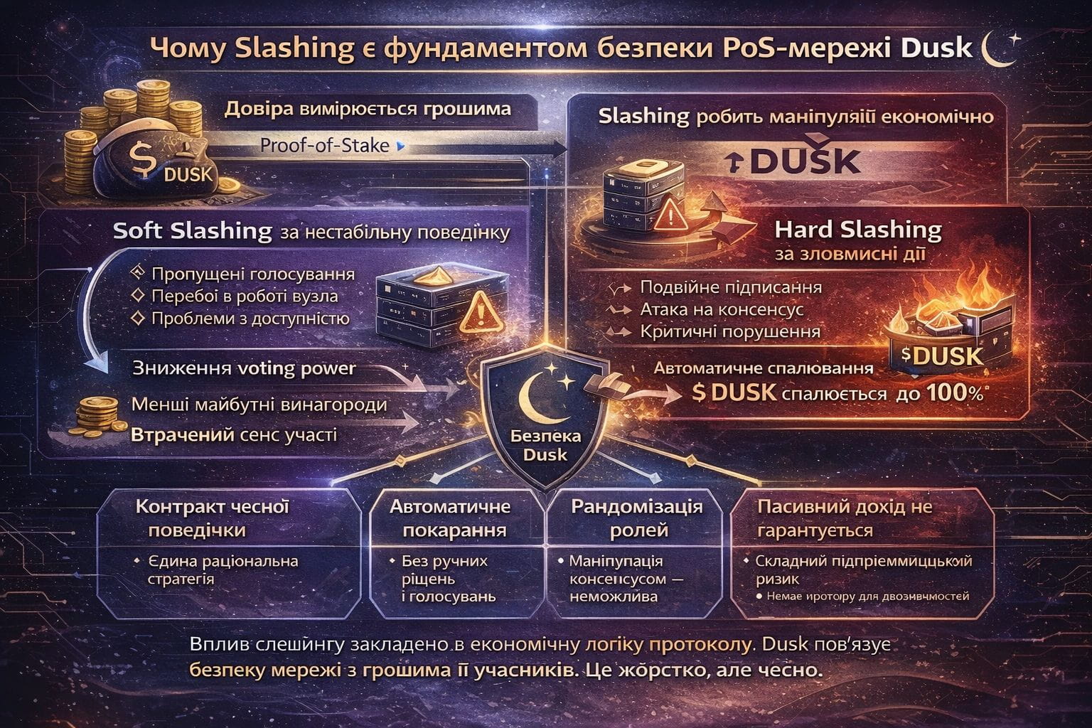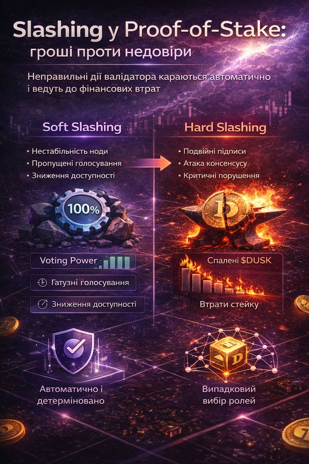 Hard slashing починається там, де закінчуються помилки й починається зловмисна поведінка. Подвійне підписання, спроби атаки на консенсус або інші критичні порушення призводять до автоматичного спалювання частини застейканих $DUSK . Важливо, що це не адміністративне рішення і не результат голосування. Покарання детерміноване протоколом і виконується без участі людей. Такий підхід виключає політизацію безпеки й робить правила однаковими для всіх.