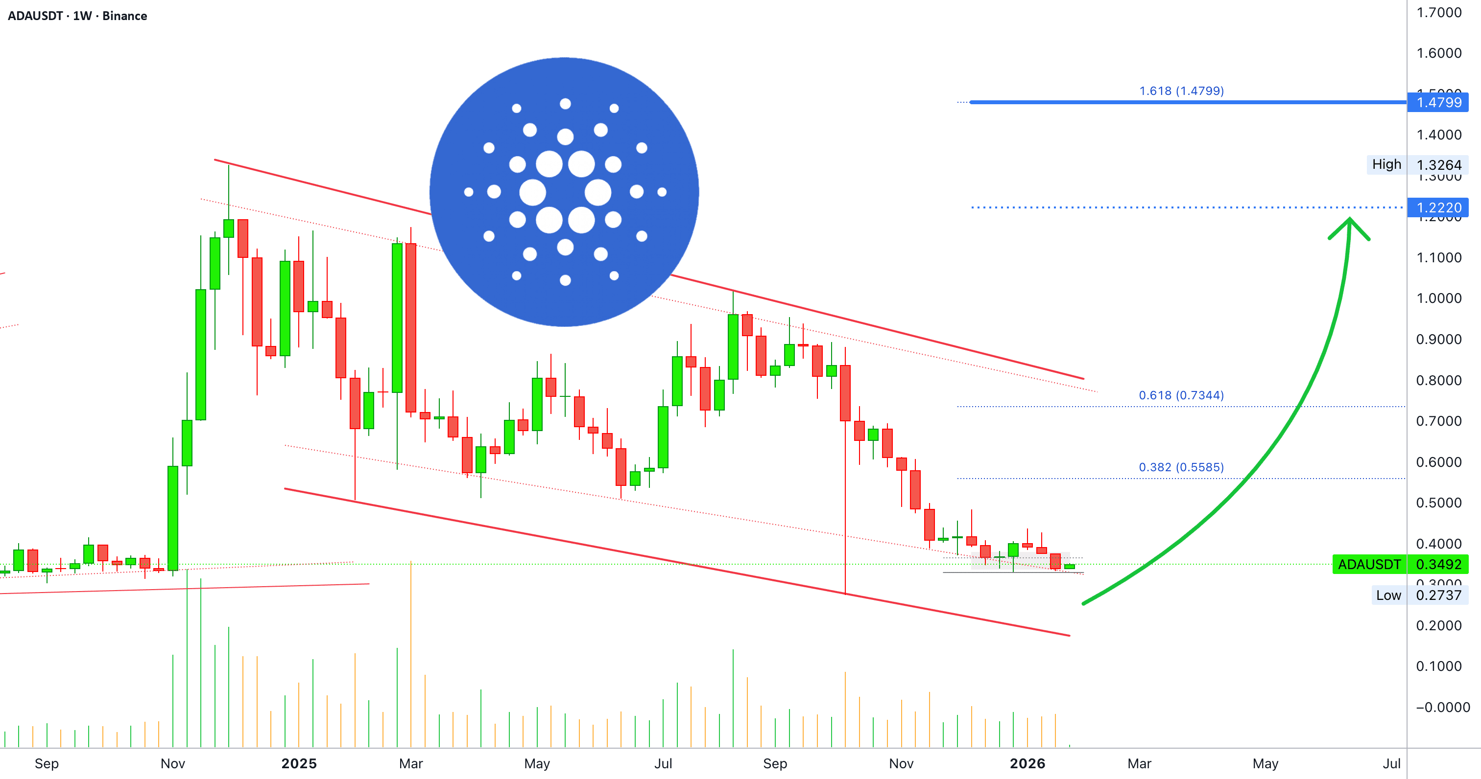 Когда активность происходила на этом же уровне в конце 2024 года, был очень сильный импульс, который привел к пику в декабре 2024 года. ADAUSDT закрылся пять недель подряд в зеленом. Затем рынок изменился на нисходящий тренд до сегодняшнего дня; минимумы и максимумы ниже. Объем рынка в снижении с марта 2025 года, когда он достиг пика. Этот сигнал поддерживает все, что связано с разворотом.